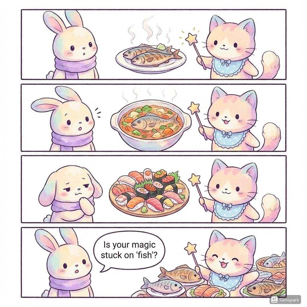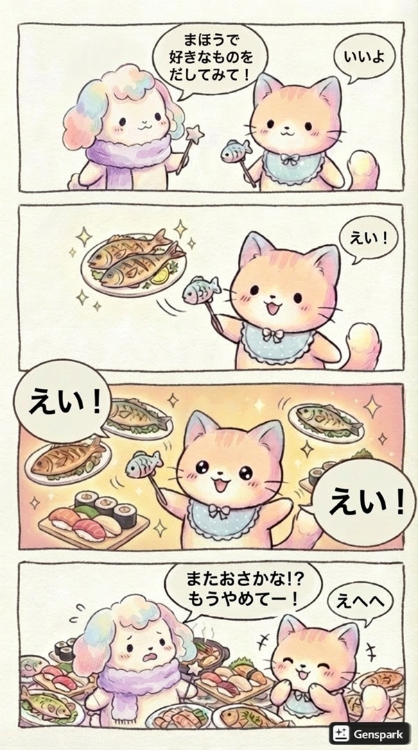 「この2人のキャラクターで4コマ漫画を作ってください。コマは縦に4つ並べます。設定は2人は見習い魔法使いで、魔法で好きなものを出し合いっこするんだけど、右のキャラクターは魚料理ばっかり出してしまい、最後に左のキャラクターが突っ込んで落ちになります。」